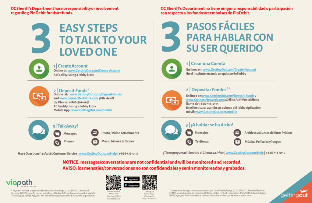 The inmate phone call, video visitation and messaging system is not owned or operated by the OC Sheriff’s Department. ViaPath Technologies (Global Tel Inc. (GTL), an outside vendor, is currently contracted to provide these services.